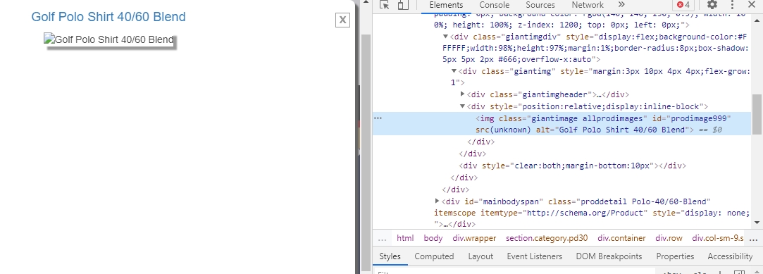 I see the source of the image is (unknown) I also see the class for the product has the product ID which looks to have the forward slash / there. Is that the case here? Can you check the filename for that image and see if it has a slash, or an html entity for one.. Maybe paste here what's showing there for that path.
